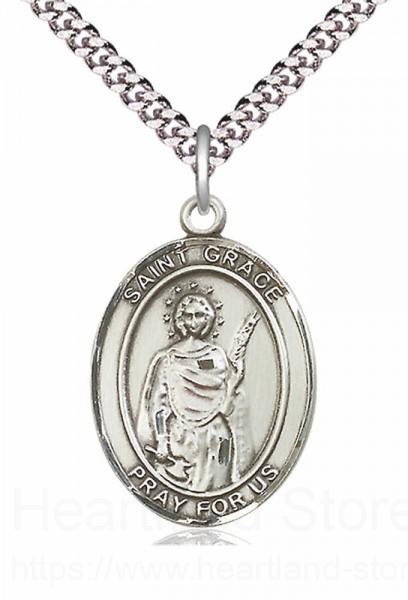 An oval shaped pendant with an image of St. Grace in the center. There is a selection of chains to choose from.