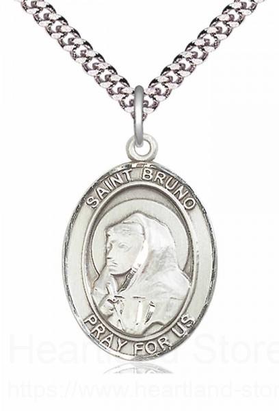 An oval shaped pendant with an image of St. Bruno in the center. There is a selection of chains to choose from.