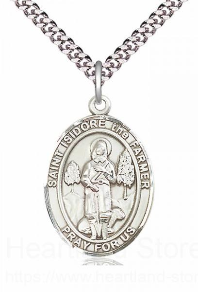 About this Men's Pewter Oval St. Isidore the Farmer Medal + 24" 2.4mm Rhodium Plate Endless Chain