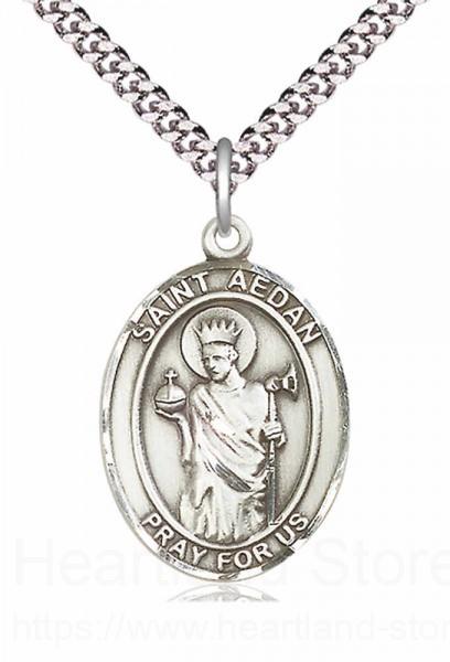 About this Men's Pewter Oval St. Aedan of Ferns Medal + 24" 2.4mm Rhodium Plate Chain + Clasp