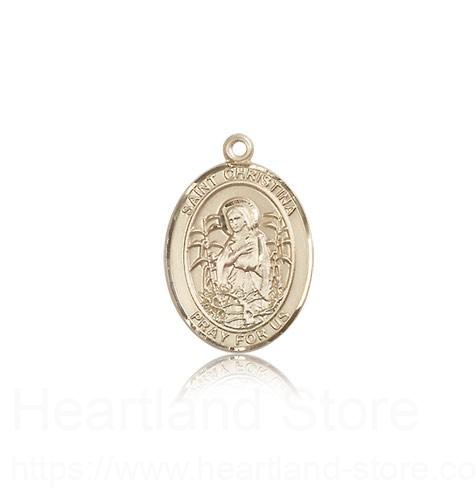 St. Christina the Astonishing Medal This St. Christina the Astonishing Pendant is made of 14 Karat Gold and is approximately the size of a nickel. The jewelry pendant is sold individually and does not come with a chain. All medals are gift boxed in a beautiful blue velvet hinged jewelry gift box.