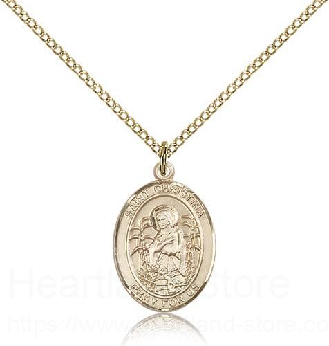 St. Christina the Astonishing Medal This St. Christina the Astonishing Pendant is made of gold filled and is approximately the size of a nickel. The jewelry pendant is paired with an 18 inch gold filled light curb chain as pictured. All medals are gift boxed in a beautiful blue velvet hinged jewelry gift box.