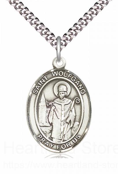 An oval shaped pendant with an image of St. Wolfgang in the center. There is a selection of chains to choose from.