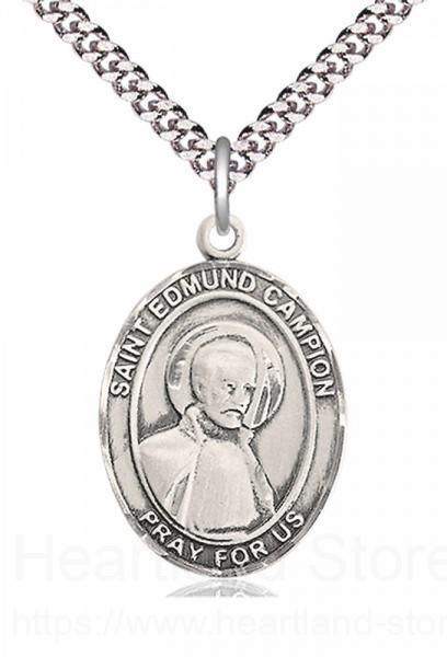 An oval shaped pendant with an image of St. Edmund Campion in the center. There is a selection of chains to choose from.