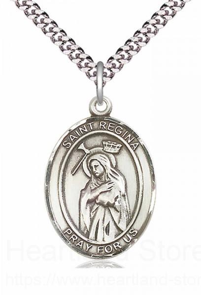 An oval shaped pendant with an image of St. Regina in the center. There is a selection of chains to choose from.