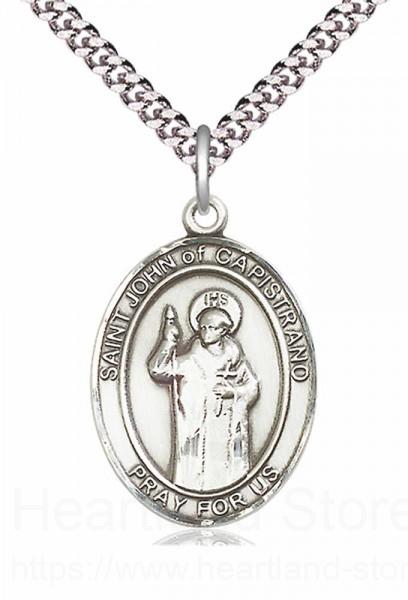An oval shaped pendant with an image of St. John of Capistrano in the center. There is a selection of chains to choose from.