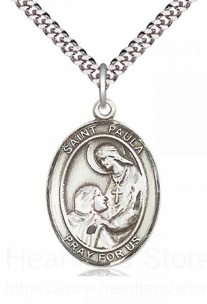 An oval shaped pendant with an image of St. Paula in the center. There is a selection of chains to choose from.