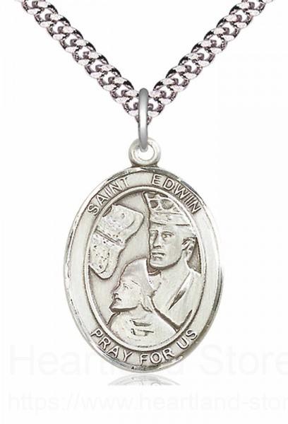 About this Men's Pewter Oval St. Edwin Medal + 24" 2.4mm Rhodium Plate Endless Chain