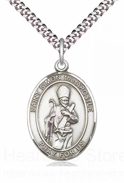 An oval shaped pendant with an image of St. Simon in the center. There is a selection of chains to choose from.