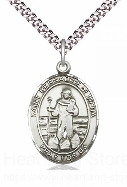 About this Men's Pewter Oval St. Bernadine of Sienna Medal + 24" 2.4mm Rhodium Plate Chain + Clasp