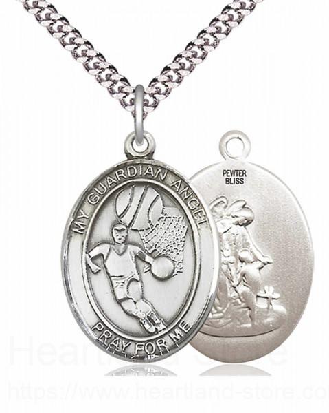 About this Men's Pewter Oval Guardian Angel Basketball Medal + 24" 2.4mm Rhodium Plate Endless Chain