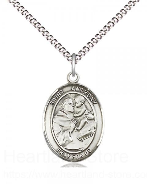 An oval shaped, dime size pendant with an image of St. Anthony of Padua in the center. There is a selection of chains to choose from.