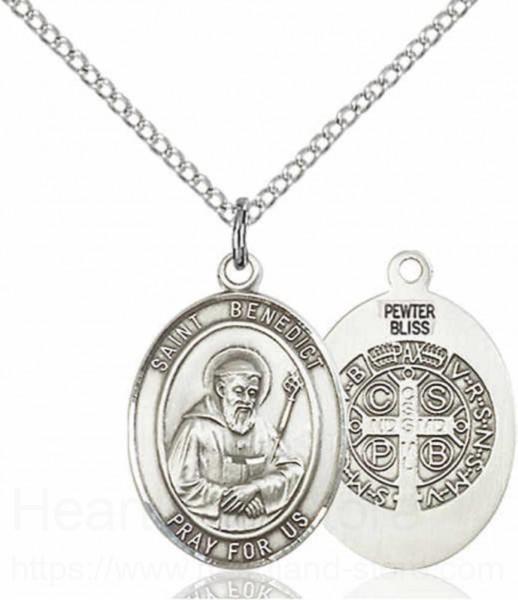 An oval shaped, dime size pendant with an image of St. Benedict in the center. There is a selection of chains to choose from.