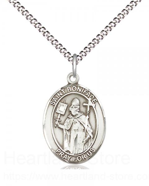 An oval shaped, dime size pendant with an image of St. Boniface in the center. There is a selection of chains to choose from.