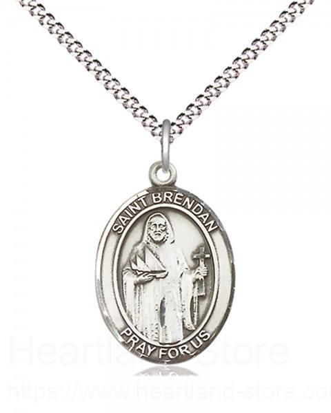 An oval shaped, dime size pendant with an image of St. Brendan the Navigator in the center. There is a selection of chains to choose from.