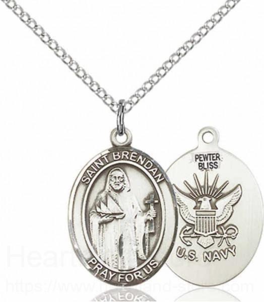 An oval shaped, dime size pendant with an image of St. Brendan the Navigator in the center with Navy insignia on the back. There is a selection of chains to choose from.