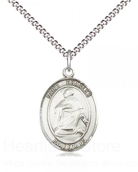 An oval shaped, dime size pendant with an image of St. Charles Borromeo in the center. There is a selection of chains to choose from.