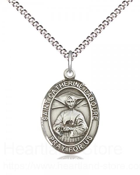 An oval shaped, dime size pendant with an image of St. Catherine Laboure in the center. There is a selection of chains to choose from.