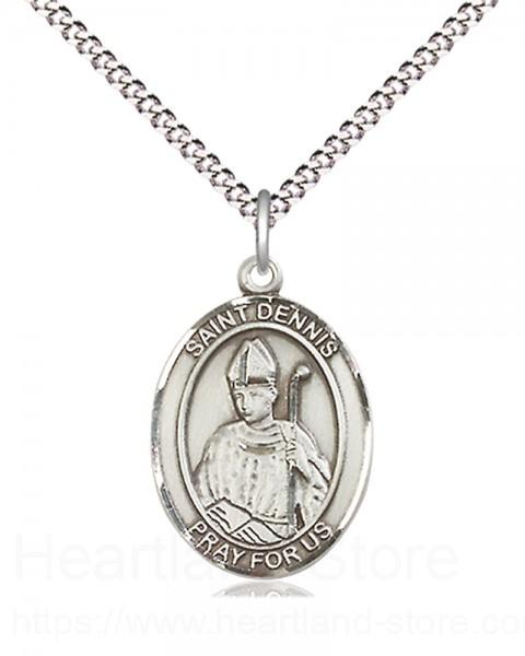 An oval shaped, dime size pendant with an image of St. Dennis in the center. There is a selection of chains to choose from.