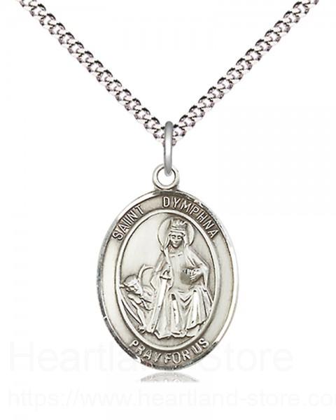 An oval shaped, dime size pendant with an image of St. Dymphna in the center. There is a selection of chains to choose from.