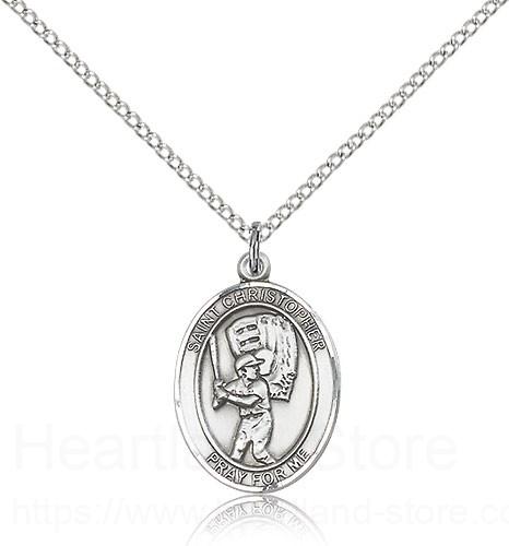 St. Christopher Baseball Medal This St. Christopher Baseball Pendant is made of sterling silver and is approximately the size of a nickel. The jewelry pendant is paired with an 18 inch sterling silver light curb chain as pictured. All medals are gift boxed in a beautiful blue velvet hinged jewelry gift box.