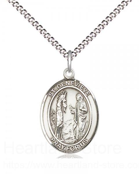 An oval shaped, dime size pendant with an image of St. Genevieve in the center. There is a selection of chains to choose from.