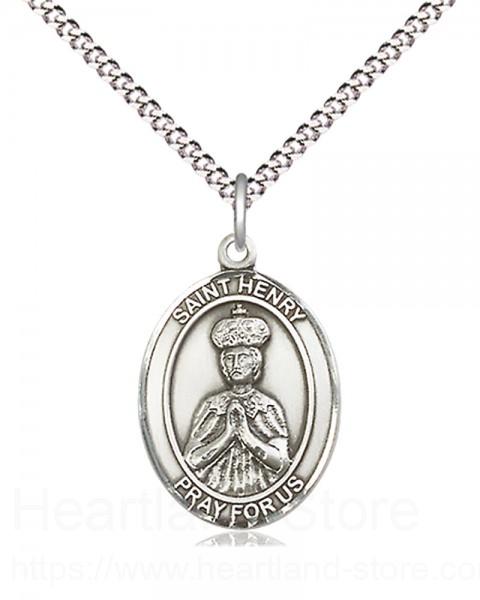 An oval shaped, dime size pendant with an image of St. Henry II in the center. There is a selection of chains to choose from.