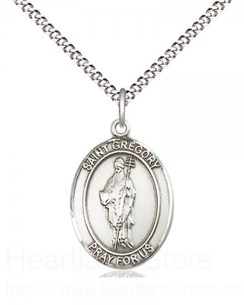 An oval shaped, dime size pendant with an image of St. Gregory the Great in the center. There is a selection of chains to choose from.