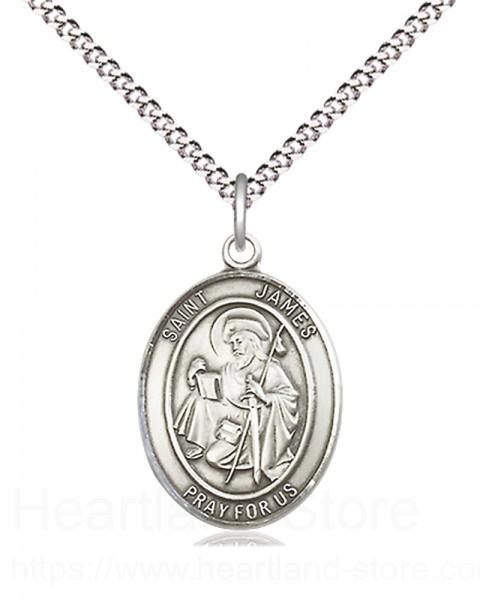 An oval shaped, dime size pendant with an image of St. James the Greater in the center. There is a selection of chains to choose from.