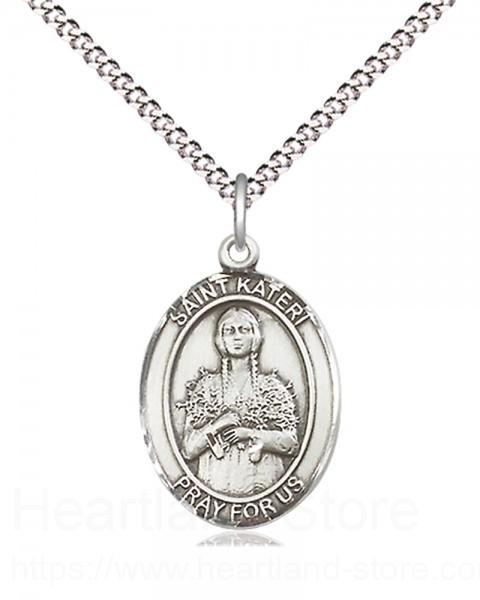 About this Women's Pewter Oval St. Kateri Medal + 18" Rhodium Plated Heavy Chain + Clasp