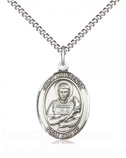 An oval shaped, dime size pendant with an image of St. Lawrence in the center. There is a selection of chains to choose from.