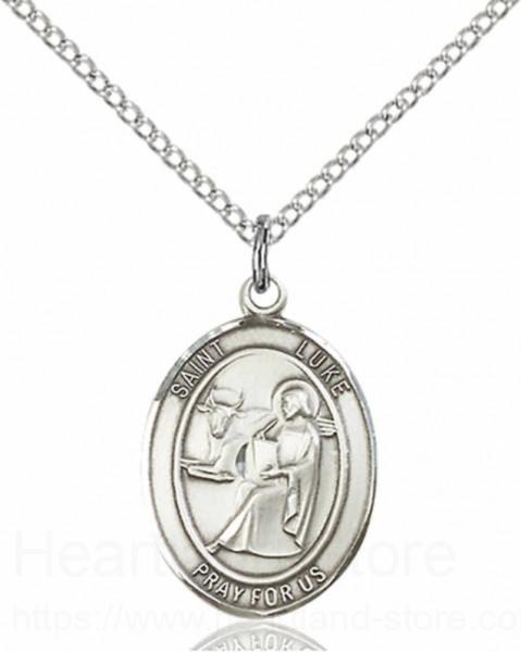 An oval shaped, dime size pendant with an image of St. Luke the Apostle in the center. There is a selection of chains to choose from.