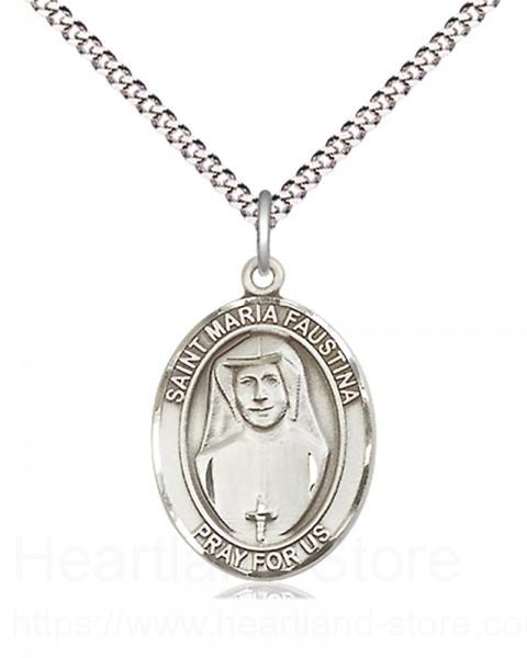 An oval shaped, dime size pendant with an image of St. Maria Faustina in the center. There is a selection of chains to choose from.