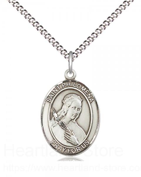 About this Women's Pewter Oval St. Philomena Medal + 18" Rhodium Plated Heavy Chain + Clasp