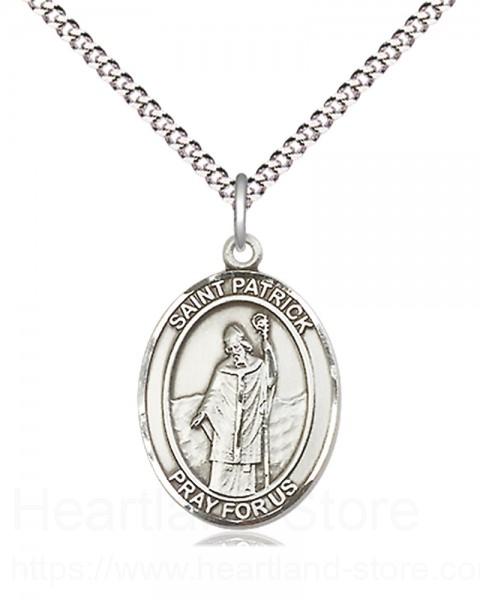 An oval shaped, dime size pendant with an image of St. Patrick in the center. There is a selection of chains to choose from.