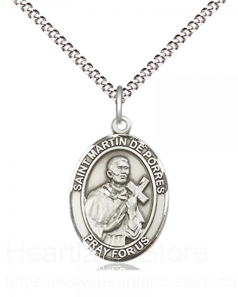 An oval shaped, dime size pendant with an image of St. Martin De Porres in the center. There is a selection of chains to choose from.