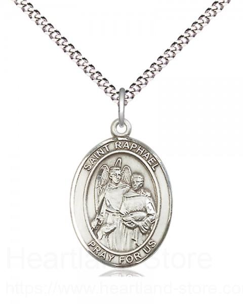 An oval shaped, dime size pendant with an image of St. Raphael the Archangel in the center. There is a selection of chains to choose from.