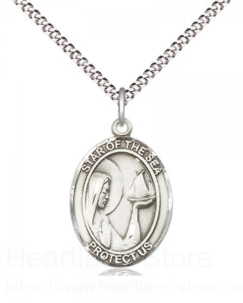 An oval shaped, dime size pendant with an image of Our Lady Star of the Sea in the center. There is a selection of chains to choose from.