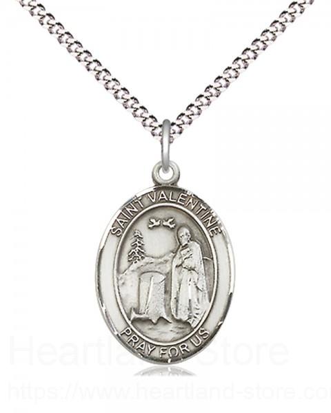 An oval shaped, dime size pendant with an image of St. Valentine of Rome in the center. There is a selection of chains to choose from.