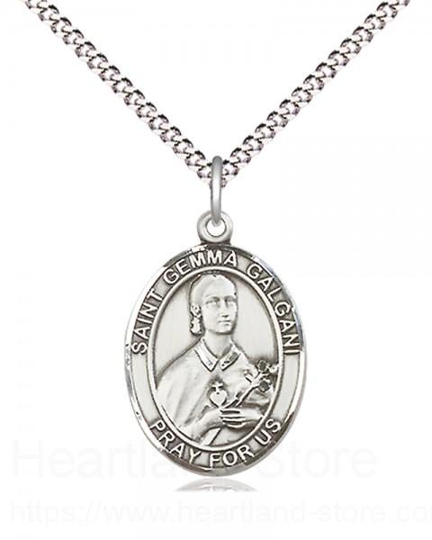 An oval shaped, dime size pendant with an image of St. Gemma Galgani in the center. There is a selection of chains to choose from.