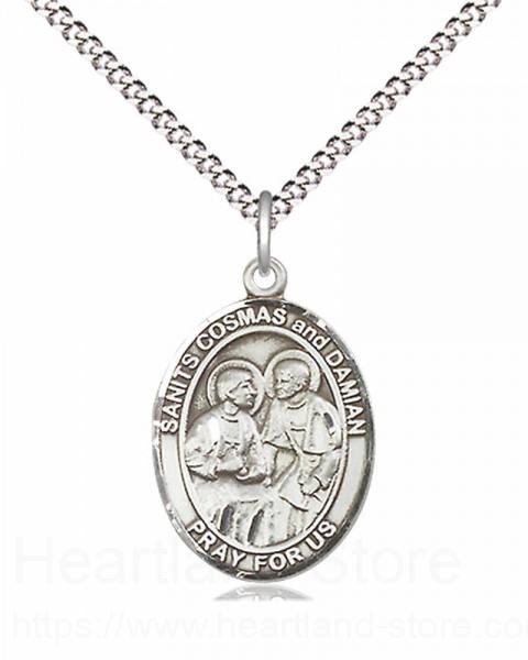 An oval shaped, dime size pendant with an image of Sts. Cosmas and Damian in the center. There is a selection of chains to choose from.