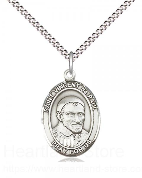 An oval shaped, dime size pendant with an image of St. Vincent De Paul in the center. There is a selection of chains to choose from.