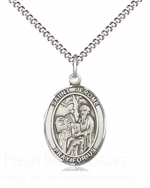 An oval shaped, dime size pendant with an image of St. Jerome in the center. There is a selection of chains to choose from.