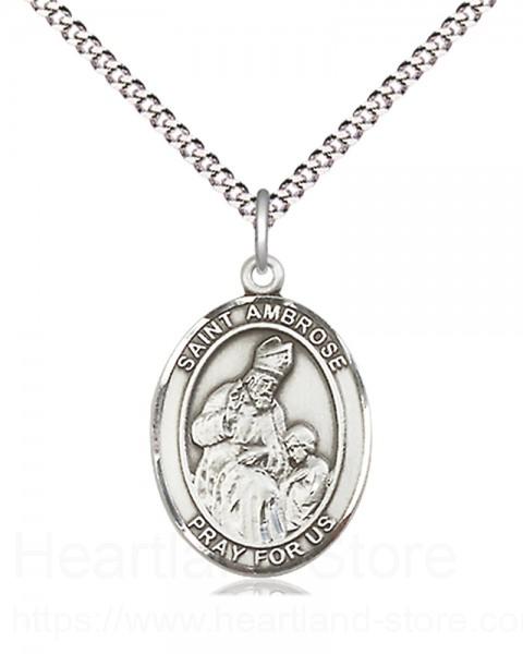 An oval shaped, dime size pendant with an image of St. Ambrose in the center. There is a selection of chains to choose from.