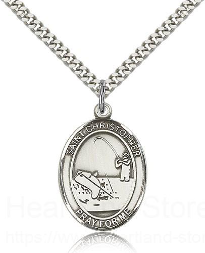 This St. Christopher Fishing Pendant is made of sterling silver and is approximately the size of a quarter. The jewelry pendant is paired with a 24 inch stainless steel heavy curb chain as pictured. All medals are gift boxed in a beautiful blue velvet hinged jewelry gift box.