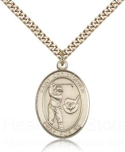 This St. Christopher Golf Pendant is made of gold filled and is approximately the size of a quarter. The jewelry pendant is paired with a 24 inch gold filled heavy curb chain as pictured. All medals are gift boxed in a beautiful blue velvet hinged jewelry gift box.