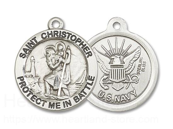 This Saint Christopher Navy Medal necklace has an image of Saint Christopher carrying baby Jesus over the river on the front, together with the text "SAINT CHRISTOPHER" around the top and "PROTECT ME IN BATTLE" around the bottom..
