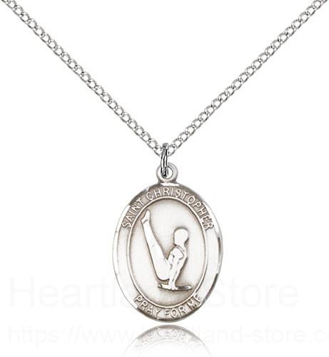 This St. Christopher Gymnastics Pendant is made of sterling silver and is approximately the size of a nickel. The jewelry pendant is paired with an 18 inch sterling silver light curb chain as pictured. All medals are gift boxed in a beautiful blue velvet hinged jewelry gift box.