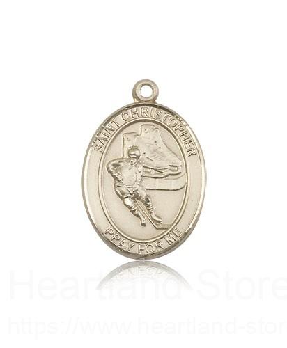 This St. Christopher Hockey Pendant is made of 14 Karat Gold and is approximately the size of a quarter. The jewelry pendant is sold individually and does not come with a chain. All medals are gift boxed in a beautiful blue velvet hinged jewelry gift box.