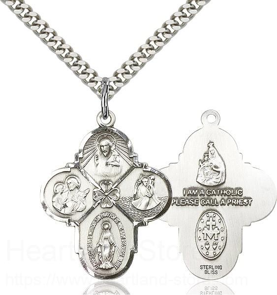 This 4 Way Cross Pendant has images of the Sacred Heart, St. Christopher, St. Joseph, and the Miraculous Medal up front. The back of the medal features the back of the Miraculous Medal and Our Lady of Mt. Caramel.